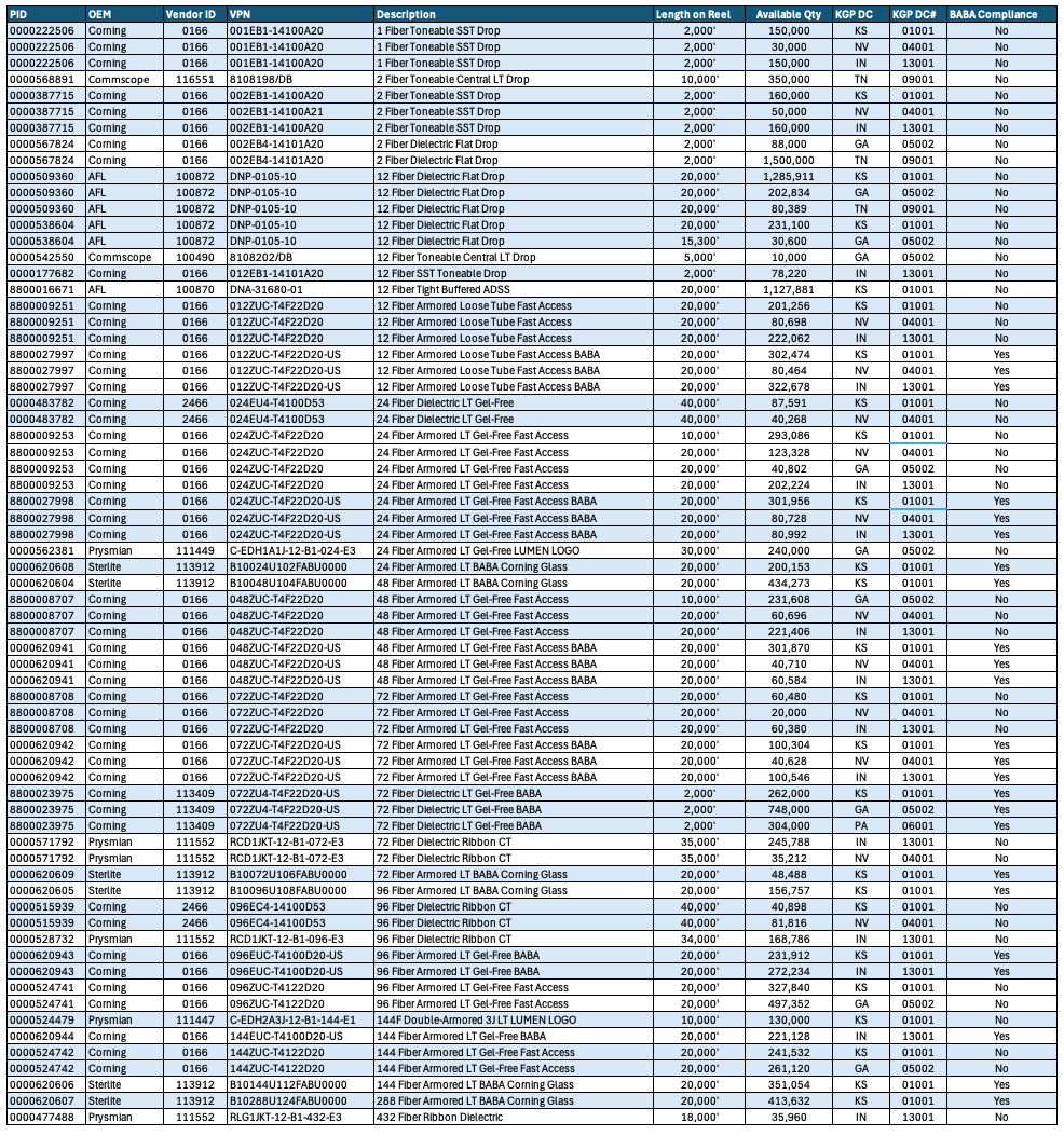 Browse our real-time inventory below, including part numbers, lengths, and available quantities, and secure the fiber you need today.